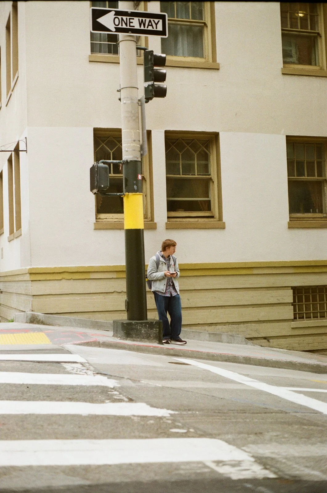 Person standing on the sidewalk at a street corner, looking at their phone, beside a pole with a one-way street sign.